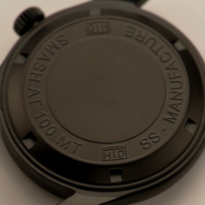 La cassa in acciaio 316L da 37 mm, con uno spessore di soli 9 mm, è trattata con rivestimento DLC (Diamond Like Carbon) da 3000 Vickers, che garantisce una resistenza superficiale estremamente elevata mantenendo allo stesso tempo elasticità e robustezza strutturale. Il risultato è una finitura nera profonda, resistente e dal forte impatto estetico.