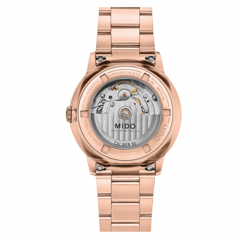 In questa versione lo troviamo con una cassa da 40mm e bracciale in acciaio inossidabile con rivestimento PVD color oro rosa, con una finitura lucida e satinate, con profilo sottile e proporzionato che si adatta perfettamente al polso. Il quadrante verde è valorizzato da indici applicati e lancette con trattamento luminescente, che assicurano leggibilità ottimale anche in condizioni di luce variabile. Il vetro zaffiro con trattamento antiriflesso fornisce una eccellente protezione da graffi e riflessi. Il fondello a vista permette di ammirare la meccanica del movimento automatico, esaltando la qualità e l’artigianalità tipiche MIDO. Il bracciale in acciaio con chiusura deployante garantisce comfort e sicurezza al polso, completando un look elegante e versatile. Con impermeabilità fino a 5 bar (50 m), questo Commander Datoday è adatto all’uso quotidiano e resiste a schizzi e pioggia leggera.