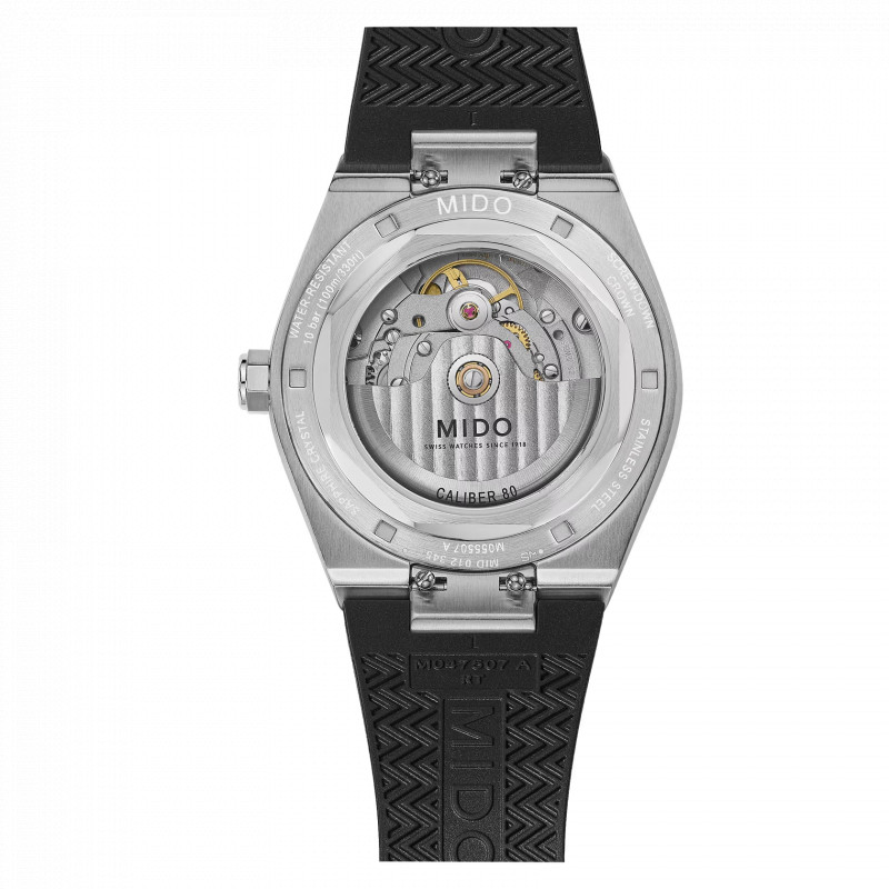 All’interno dell’orologio batte il collaudato Calibro Mido 80, movimento automatico svizzero apprezzato per precisione e affidabilità. La riserva di carica fino a 80 ore rappresenta un plus concreto per chi alterna più orologi, offrendo libertà e praticità nell’utilizzo quotidiano. Il fondello trasparente consente di ammirare il movimento, aggiungendo un tocco tecnico e raffinato.