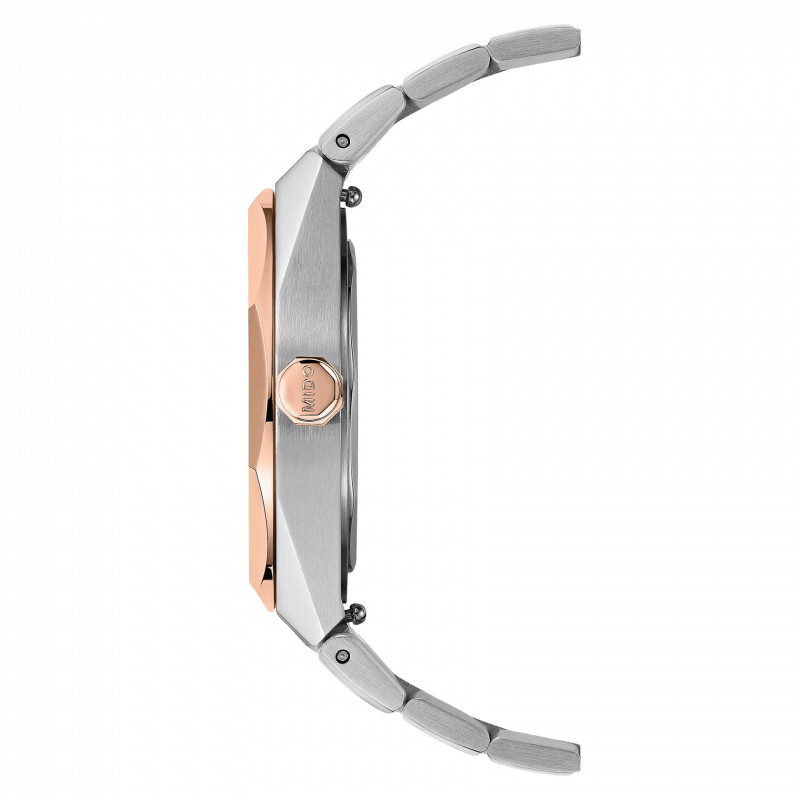 Il Mido Multifort 8 One Crown interpreta lo spirito sportivo della collezione in una chiave più elegante e raffinata, grazie alla combinazione bicolore acciaio e PVD color oro rosa. Un orologio automatico Swiss Made pensato per chi desidera distinguersi con discrezione, senza rinunciare a solidità e affidabilità tecnica.