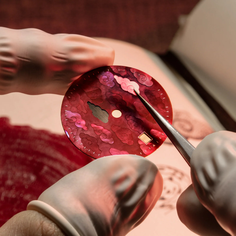 Il quadrante in madreperla rossa, composto interamente a mano con lavorazione a mosaico, riprende il tradizionale motivo delle nuvole, simbolo di prosperità nella cultura cinese. Le sue sfumature cangianti rendono ogni esemplare unico, mentre gli indici dorati e i dettagli ispirati agli ideogrammi rafforzano il legame con l’estetica orientale.