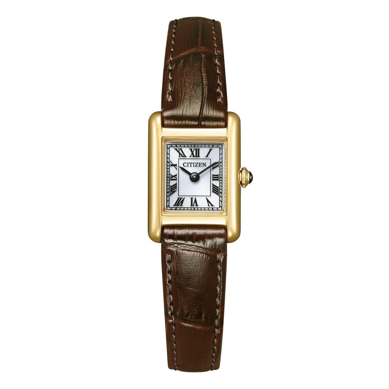 Elegante orologio da donna Citizen Lady EG2797-13A con quadrante bianco con indici romani, cassa rettangolare in acciaio con trattamento IP Gold, cinturino in pelle marrone, movimento Eco Drive a carica luce, vetro zaffiro, resistente fino a WR 5bard