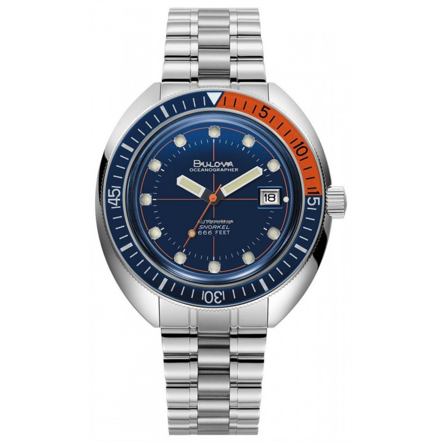 Datario a ore 3. Lunetta girevole in blu e arancione. Funzione calendario. Vetro zaffiro curvo con trattamento anti riflesso. Cinturino in acciaio inossidabile con chiusura a dèployante con barra di sicurezza ed estensore sopra la muta.