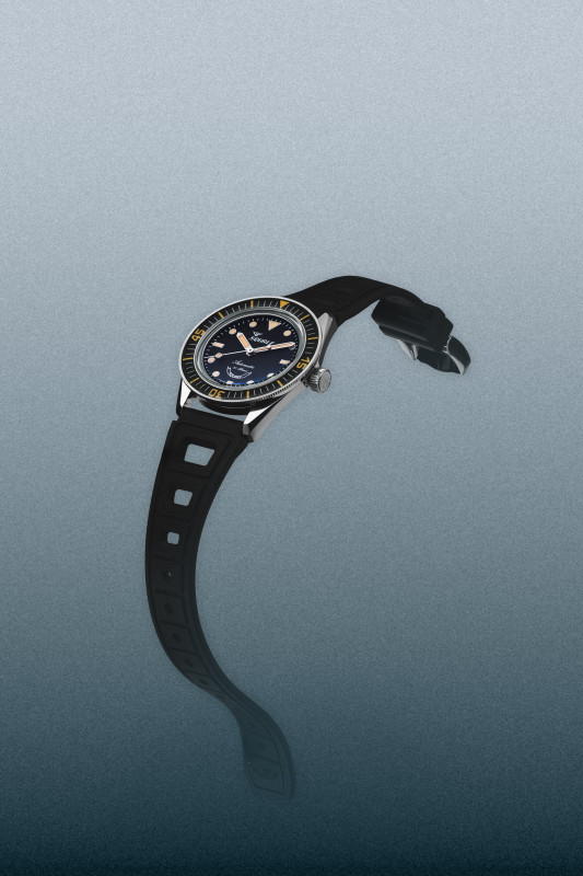 Il quadrante nero è essenziale e altamente leggibile, con indici stampati e Super-LumiNova Old Radium, che conferiscono un’estetica rétro e una visibilità eccellente anche nelle condizioni più difficili. Le proporzioni compatte richiamano i diver storici, mantenendo un perfetto equilibrio tra funzionalità e stile.