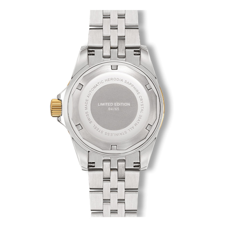 Il vetro zaffiro piatto con trattamento antiriflesso interno e l’impermeabilità fino a 200 metri confermano la vocazione avventurosa del modello, mentre il bracciale in acciaio dorato con chiusura deployante completa l’orologio con un tocco di lusso.