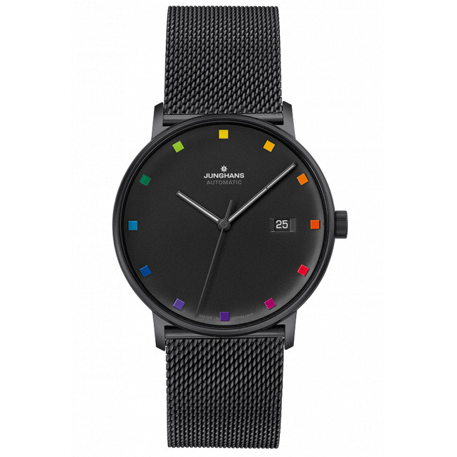Il Junghans Bauhaus Limited Edition 27/4533.44 è un orologio automatico che celebra in stile creativo il centenario della scuola Bauhaus. La cassa in acciaio da 39,3 mm è rifinita con rivestimento nero PVD e ospita un quadrante nero opaco caratterizzato da indici multicolore ispirati ai principi cromatici del Bauhaus. Al suo interno batte il calibro J800.2, dotato di riserva di carica fino a 38 ore. Il vetro zaffiro antiriflesso protegge il quadrante, mentre il fondello trasparente mostra parte della meccanica, decorato con il motivo della scuola di design.