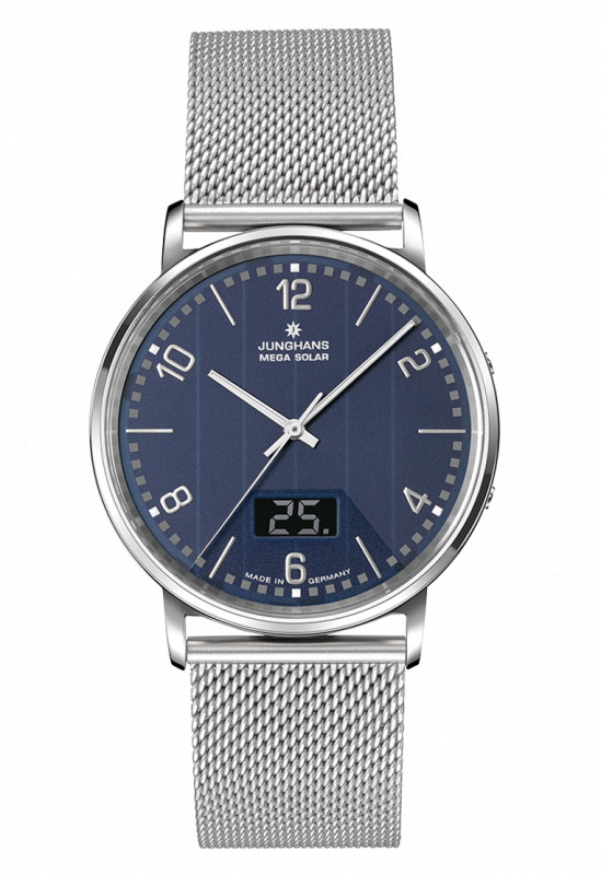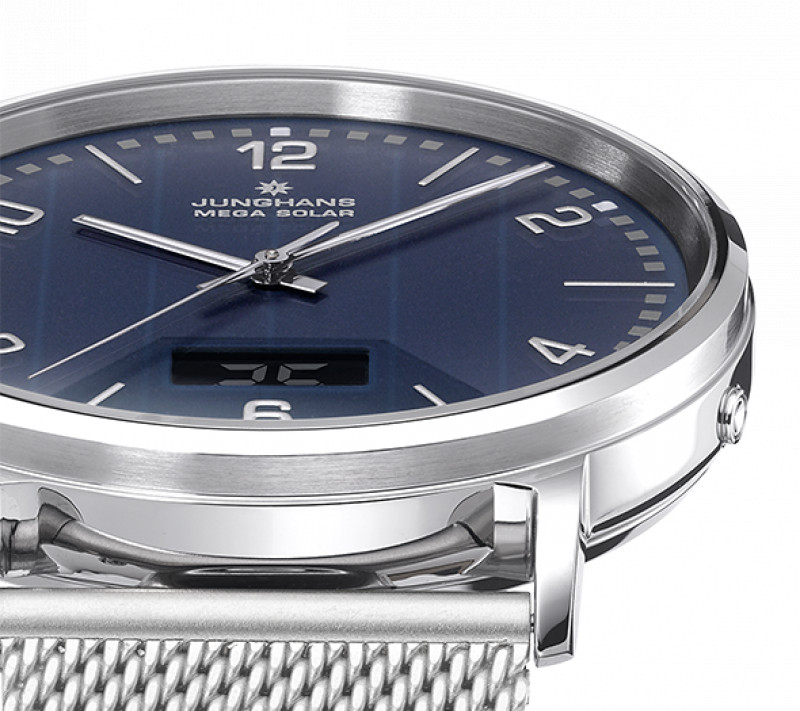 La cassa in acciaio inossidabile da 39,2 mm, con uno spessore contenuto di 8,4 mm, conferisce al segnatempo un profilo elegante e discreto, perfetto per l’uso quotidiano. Il quadrante è realizzato in vetro blu glass-solar, un elemento distintivo ottenuto attraverso numerosi passaggi di molatura e stampa nei laboratori Junghans, che integra la cella solare mantenendo un’estetica pulita e raffinata.