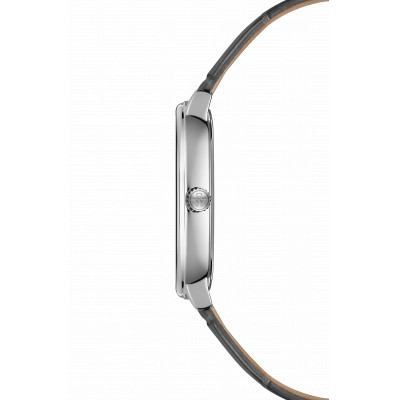 Il quadrante color argento antico con finitura soleil è arricchito da indici applicati e lancette dauphine lucide, che ne esaltano la raffinatezza e la leggibilità.
