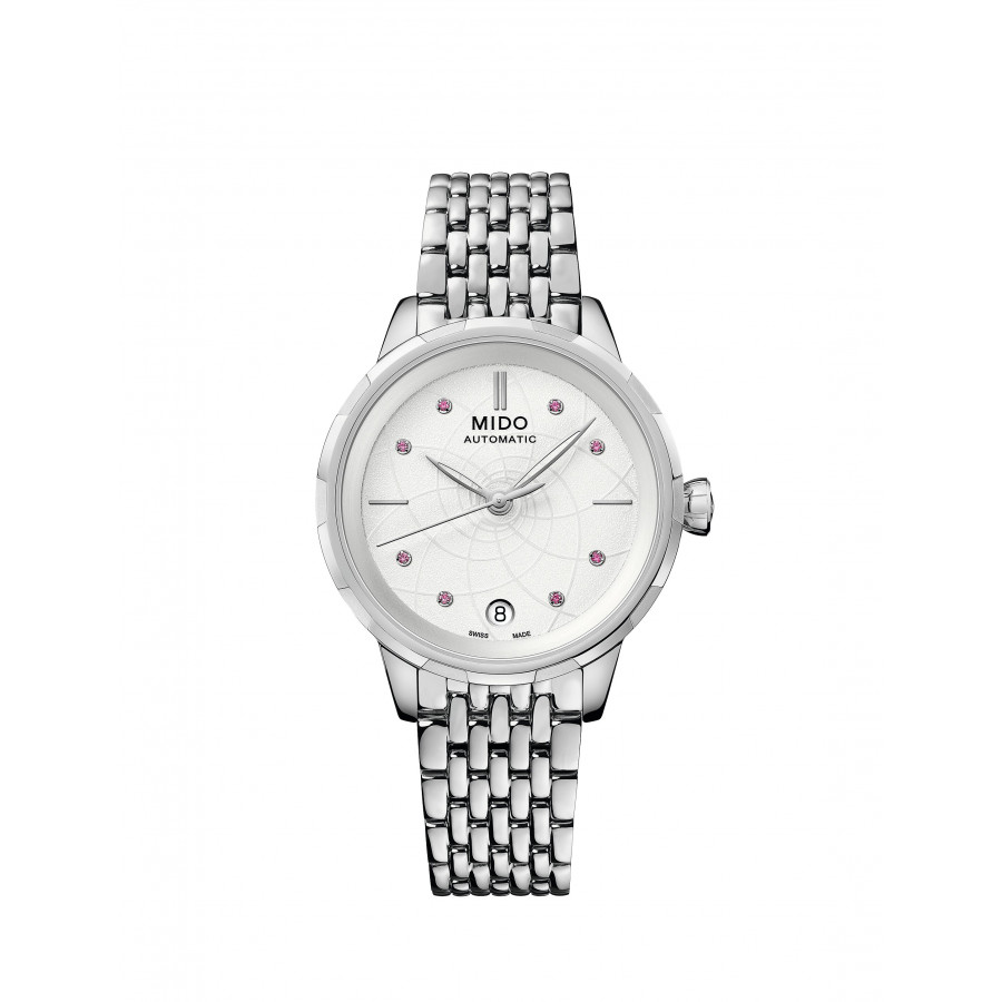 Orologio Mido Rainflower M043.207.16.116.00 realizzato in acciaio inossidabile con cassa da 34 mm.  Il vetro è zaffiro con trattamento antiriflesso su entrambi i lati e il quadrante in maderperla bianca. L'orologio è arricchito da tre pietre preziose rosa. Il cinturino è braccialato con chiusura a deployante.