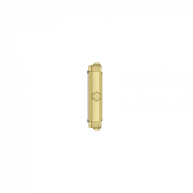 La cassa rettangolare in acciaio 316L con trattamento PVD oro giallo, dalle dimensioni di 30 mm x 21,8 mm e con uno spessore sottile di 7,25 mm, dona al polso un’eleganza discreta e senza tempo. Il nome SRV (Sapphire Rectangle V) richiama il suo elemento distintivo: il vetro zaffiro sfaccettato antigraffio, che esalta la luce e valorizza la silhouette geometrica del modello.