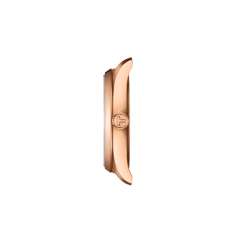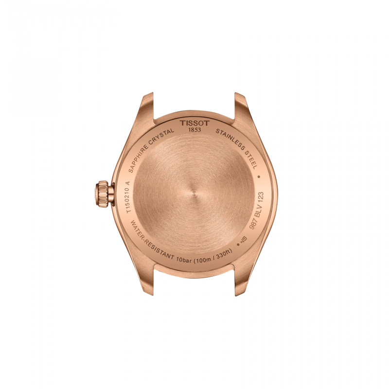Il Tissot PR 100 T150.210.33.291.00 è un orologio da donna che unisce raffinatezza estetica e precisione svizzera. La cassa da 34 mm in acciaio è impreziosita da una finitura in PVD oro rosa, che dona un tocco caldo e femminile, abbinata a un quadrante marrone soleil luminoso con indici applicati e datario a ore 6.